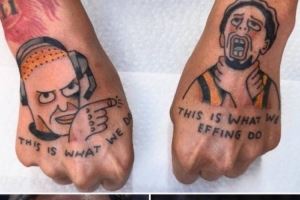 体育资讯8月22日讯 近日,一位步行者球迷将哈利伯顿在今年季后赛锁喉庆祝以及雷吉-米勒的照片分别文在了自己的双手背上。